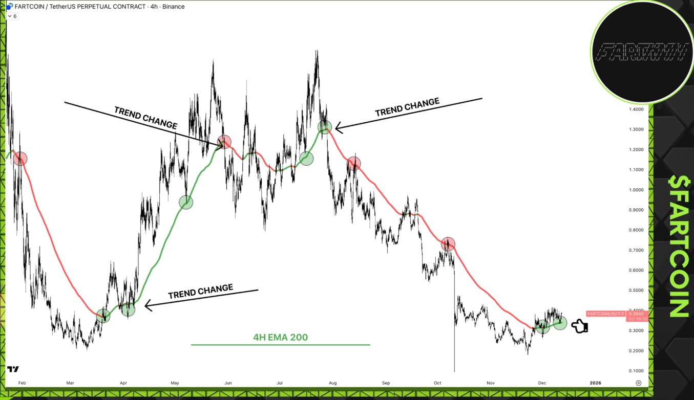 Theo nhà phân tích Sjuul, việc FARTCOIN bứt lên trên đường EMA 200 trên khung thời gian 4 giờ được xem là một tín hiệu kỹ thuật mang tính bước ngoặt. Đường EMA 200 vốn đóng vai trò như “la bàn” của xu hướng dài hạn, và việc giá giữ vững phía trên ngưỡng này giúp làm suy yếu kịch bản tiếp diễn đà giảm, qua đó giảm thiểu rủi ro điều chỉnh sâu hơn.