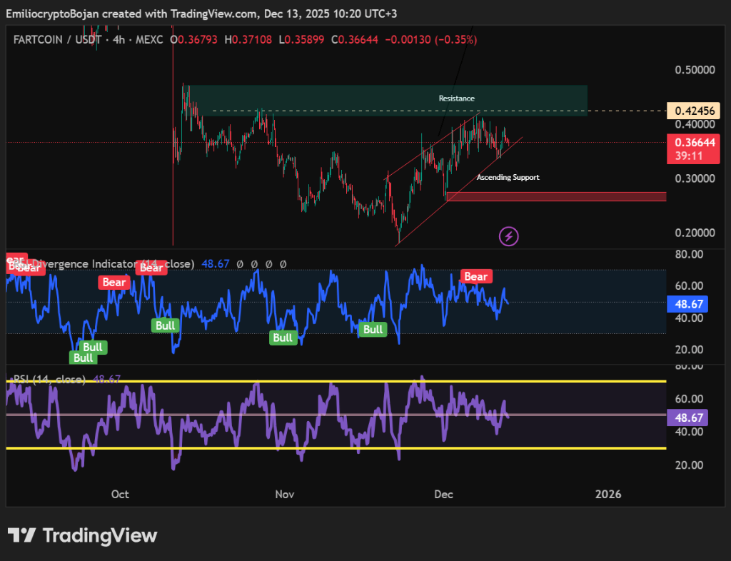 Cho đến khi xuất hiện một cú bứt phá rõ ràng, giá vẫn bị kìm nén giữa đường hỗ trợ tăng dần và kháng cự phía trên, đặt FARTCOIN vào vùng nhạy cảm, đầy rủi ro nhưng cũng tiềm ẩn cơ hội lớn.