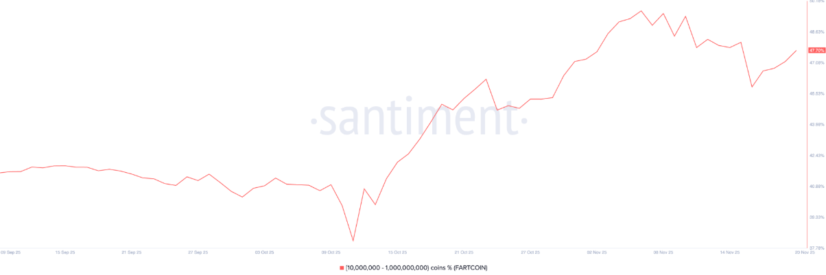 Dữ liệu của Santiment cho biết nhóm ví nắm giữ từ 10 triệu đến 1 tỷ token đã nâng tỷ lệ sở hữu lên 47,70% tổng nguồn cung on-chain, tăng từ mức 45,87% ghi nhận vào Chủ nhật. Khi các ví lớn tiếp tục mở rộng vị thế, FARTCOIN có thể đứng trước cơ hội bứt phá mạnh hơn, trong bối cảnh nguồn cung thu hẹp và tâm lý thị trường cải thiện rõ rệt — với “smart money” đang đặt cược mạnh mẽ vào triển vọng tăng trưởng của meme coin này.