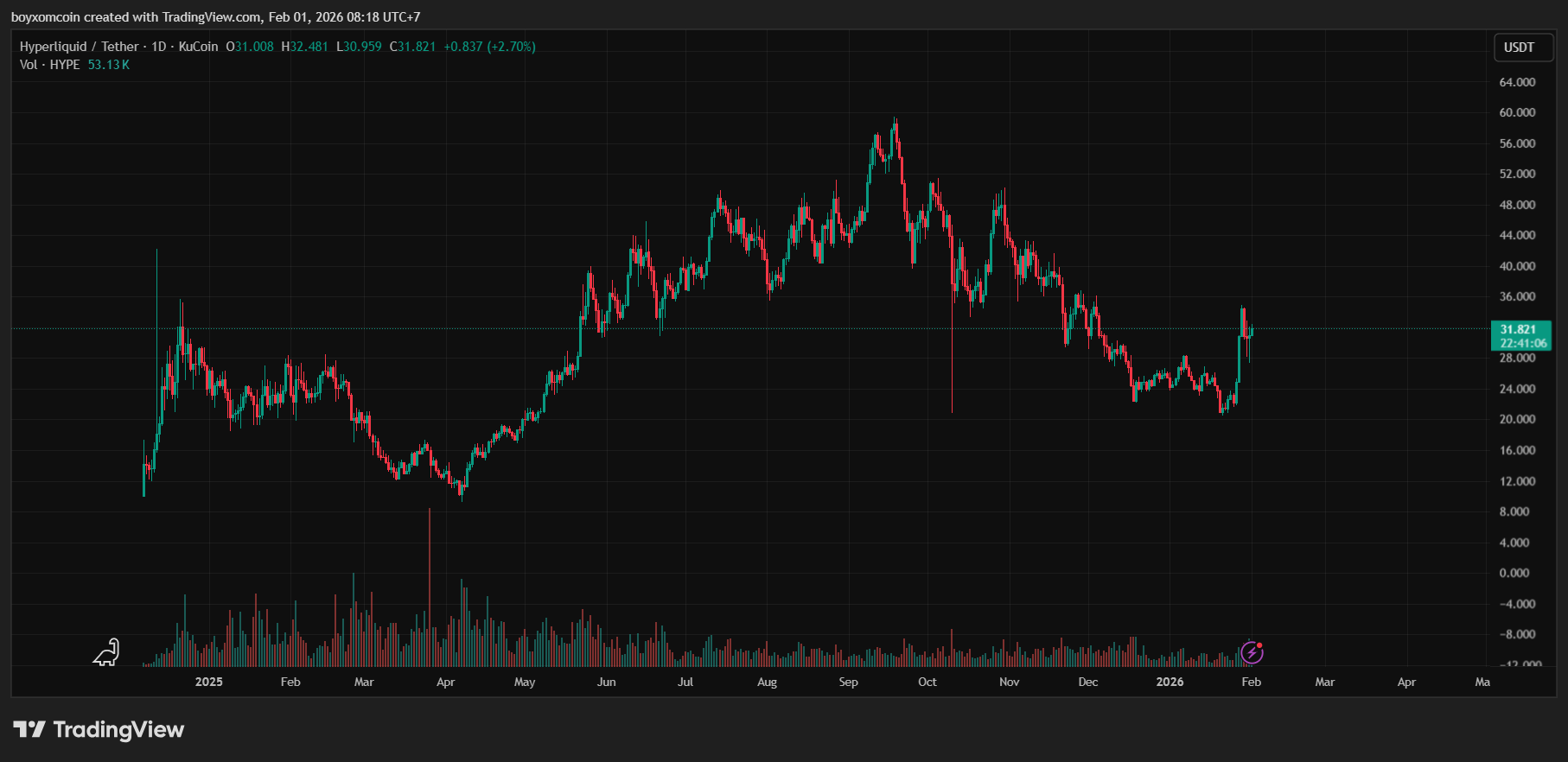 Theo dữ liệu từ TradingView, Hyperliquid (HYPE) hiện được giao dịch quanh mức 31,8 USD, với vốn hóa thị trường đạt khoảng 9,6 tỷ USD. Đáng chú ý, giá HYPE tăng 1,64% trong ngày và bứt phá tới 32,42% chỉ trong một tuần. Đà tăng này diễn ra song song với việc khối lượng giao dịch hàng ngày giảm 13,49%, cho thấy thị trường đang vận động linh hoạt và đầy biến động.