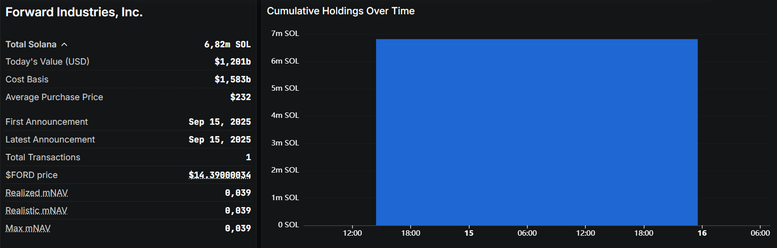 Theo dữ liệu từ Defillama, công ty Forward Industries, Inc. (Nasdaq: FORD) – doanh nghiệp chuyên về phân tích dữ liệu trên mạng Solana – hiện đang nắm giữ khoảng 6,82 triệu token SOL, được mua với giá trung bình 232 USD mỗi token. Tổng giá trị khoản đầu tư này hiện vào khoảng 1,2 tỷ USD, tương ứng mức lỗ chưa thực hiện khoảng 24,13%, tức khoảng 382 triệu USD.