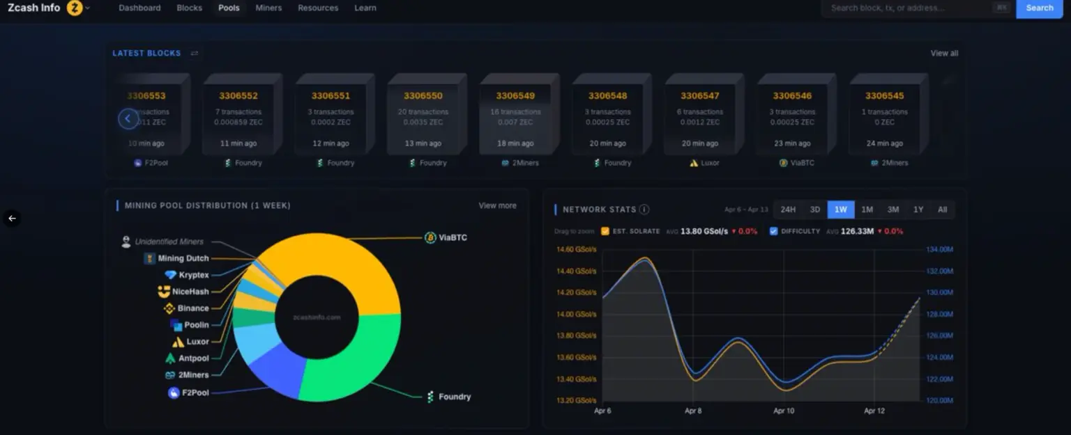 Bên cạnh việc ra mắt pool, Foundry cũng công bố ra mắt Zcashinfo.com, “một trình khám phá khối mới được xây dựng cho cộng đồng Zcash”. Trang web này được xây dựng để cung cấp cho thợ đào một điểm dừng chân duy nhất cho “xếp hạng pool theo thời gian thực, phân bổ tỷ lệ băm, dữ liệu khối, xu hướng độ khó mạng lưới,” v.v.