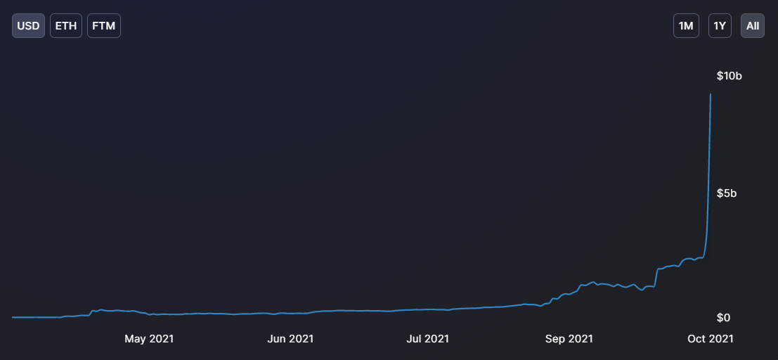 Vào ngày 6/10, TVL của Fantom là 2,4 tỷ đô la, một con số phù hợp với mức tăng ổn định trước đó. Trong 48 giờ tiếp theo, TVL tăng thêm 7 tỷ đô la, đạt 9,01 tỷ đô la vào thời điểm viết bài.