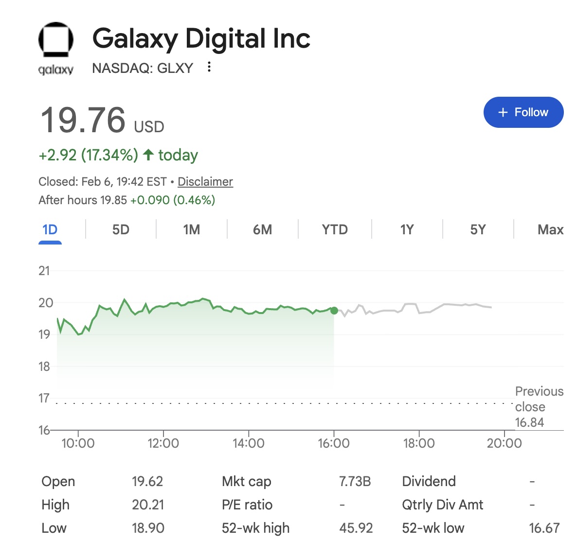 Cổ phiếu Galaxy Digital (GLXY) bật tăng 18% lên 19,90 USD trong phiên cuối tuần sau khi công ty phê duyệt chương trình mua lại cổ phiếu trị giá tối đa 200 triệu USD, triển khai trong vòng 12 tháng tới. Theo công bố, Galaxy có thể thực hiện mua lại trên thị trường mở, thông qua các giao dịch thỏa thuận riêng hoặc các kế hoạch giao dịch theo Rule 10b5-1, đồng thời giữ quyền tạm dừng hoặc chấm dứt chương trình tùy điều kiện thị trường.