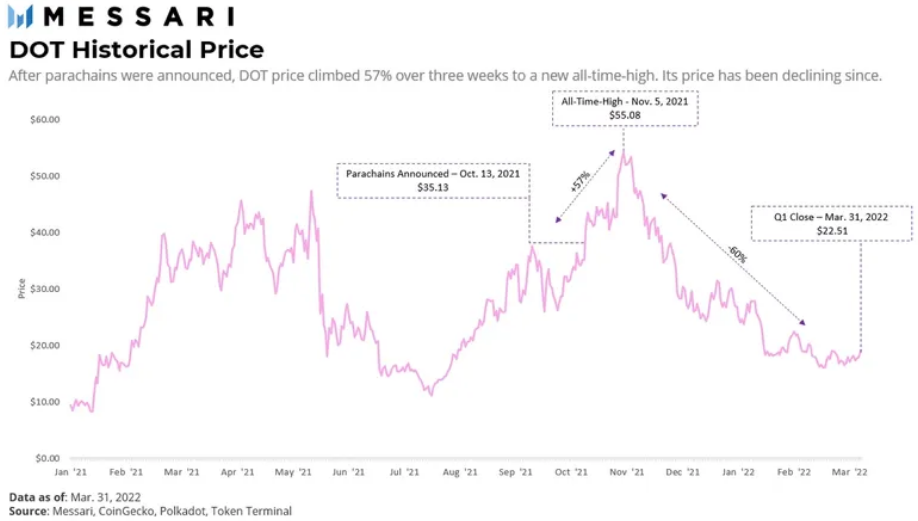 Một ngày sau khi giao thức phê duyệt phiên đấu giá vị trí parachain đầu tiên vào ngày 11 tháng 11 năm ngoái, DOT đạt ATH ở mức 55,08 đô la. Tuy nhiên, kể từ đó, giá của tài sản đã chìm trong xu hướng giảm cùng với thị trường rộng lớn hơn.