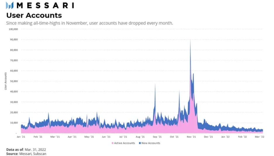 Mạng Polkadot cũng phải đối mặt với những thách thức nghiêm trọng khi bước sang năm 2022. Báo cáo cho biết sự quan tâm đến hệ sinh thái đã giảm sau khi người dùng tràn vào để tham gia các cuộc đấu giá vị trí parachain hồi tháng 11 năm ngoái.