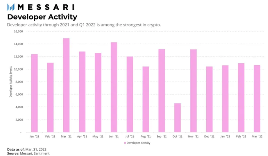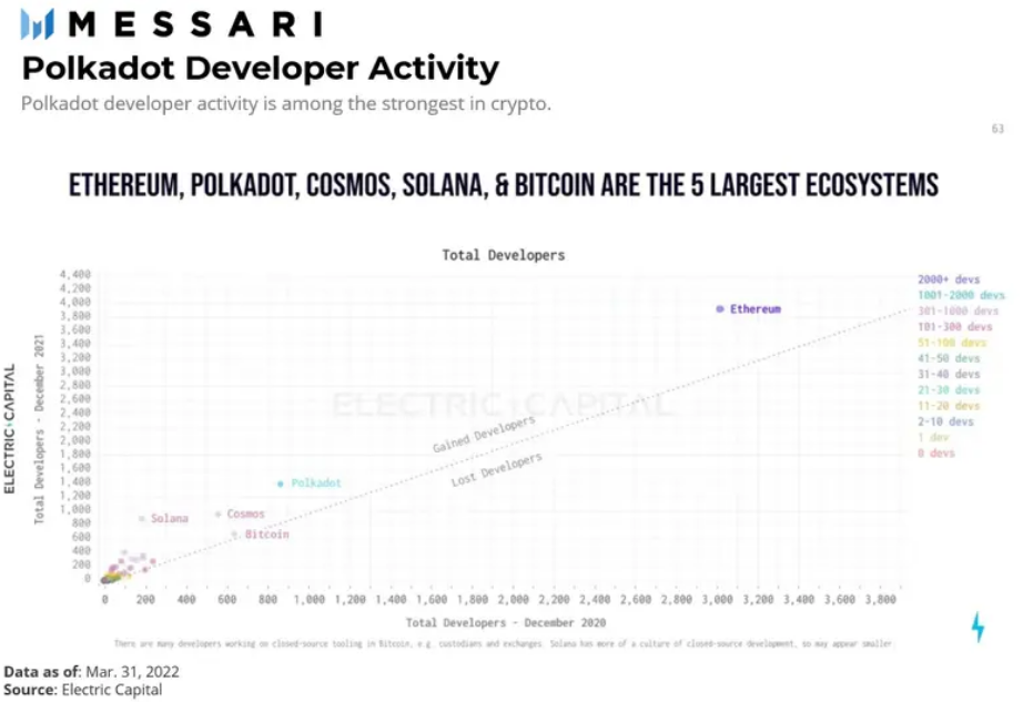 Hoạt động của nhà phát triển đến năm 2021 và Q1 2022 là nhất quán, với 14/15 tháng (93%) đăng ký hơn 10.000 sự kiện hoạt động của nhà phát triển. Có một ngoại lệ là vào tháng 10 năm 2021 khi các nhà phát triển chuyển trọng tâm sang hỗ trợ các parachain tiềm năng để đón đầu các cuộc đấu giá đầu tiên. Quý 1 năm 2022 đã chứng kiến hoạt động trung bình hàng tháng của nhà phát triển giảm 10% do các nhà phát triển ưu tiên kích hoạt các tính năng đã triển khai trước đó hơn là phát triển các tính năng mới. Nhìn chung, hoạt động của nhà phát triển Polkadot là một trong những hoạt động mạnh nhất trong lĩnh vực tiền điện tử.