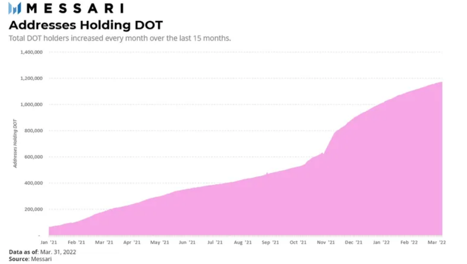 Trong khi đó, số lượng địa chỉ nắm giữ DOT đã tăng đều đặn trong suốt năm 2021 và Q1 2022, cho thấy sự quan tâm không ngừng đối với hệ sinh thái mặc dù thị trường vẫn giảm.