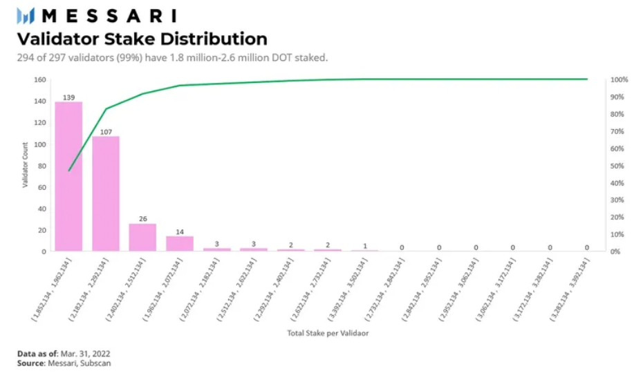 Bằng cách áp dụng cơ chế đồng thuận Proof-of-Stake (NPoS) được đề cử thiết kế để phân cấp bộ xác thực của mạng, Polkadot đã có 294 trong số 297 (99%) trình xác thực nhận được 1,8–2,6 triệu DOT.