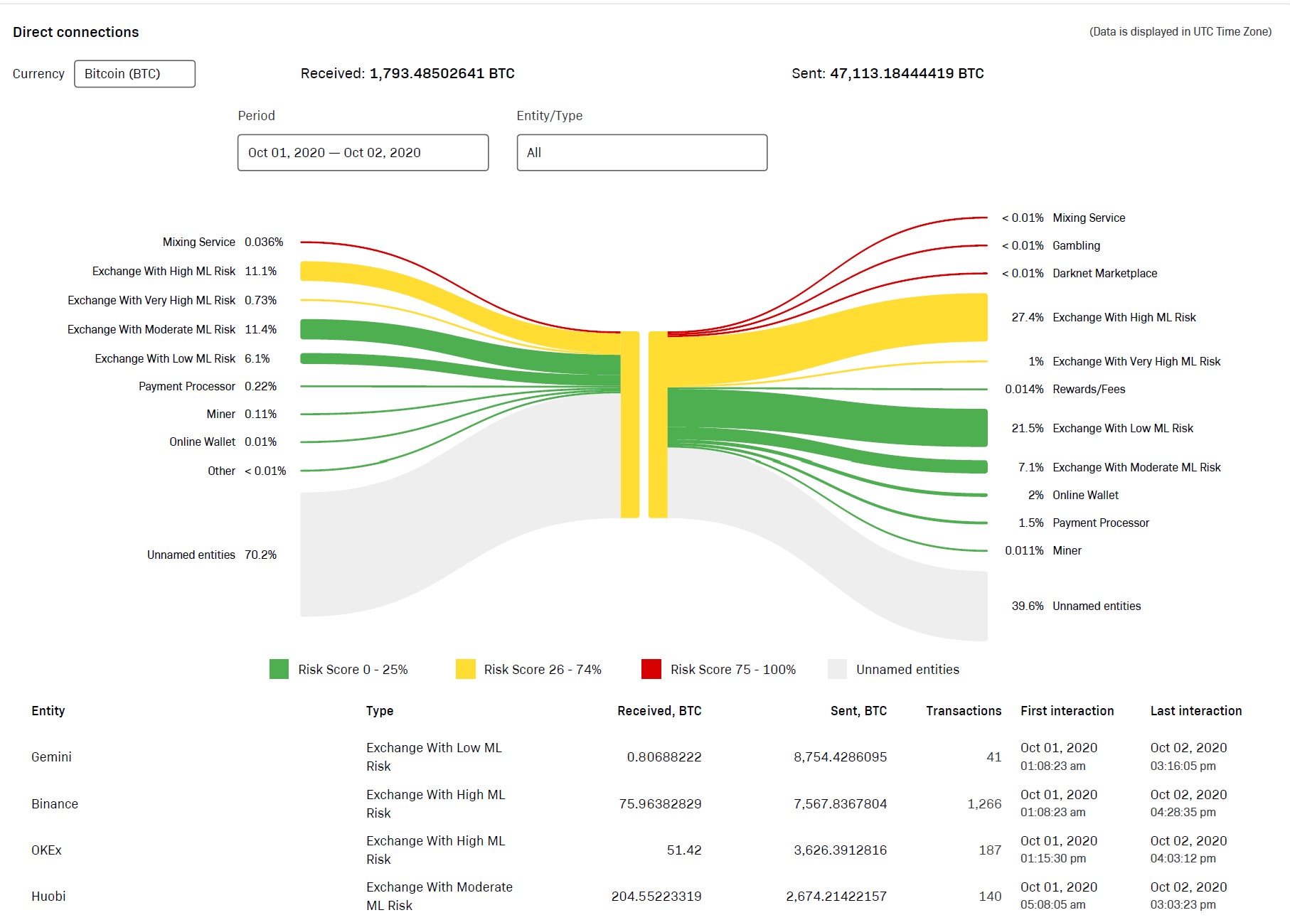 Bitcoin vào & ra trên sàn BitMex từ ngày 1-2 tháng 10 năm 2020 | Nguồn: Crystal Blockchain