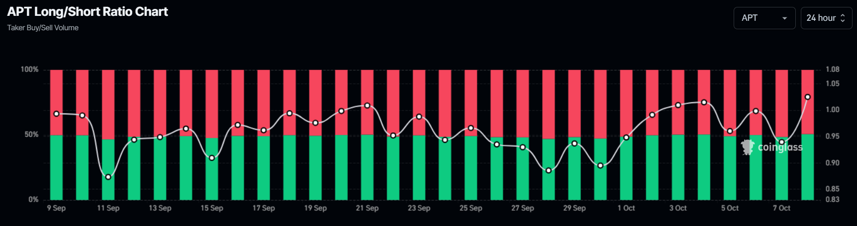 Tỷ lệ long – short của Coinglass hiện ở mức 1,04, cao nhất trong vòng một tháng qua, càng củng cố thêm triển vọng lạc quan cho Aptos. Tỷ lệ này vượt mức một phản ánh tâm lý tích cực trên thị trường, khi nhiều trader đang đặt cược vào việc giá tài sản sẽ tăng.