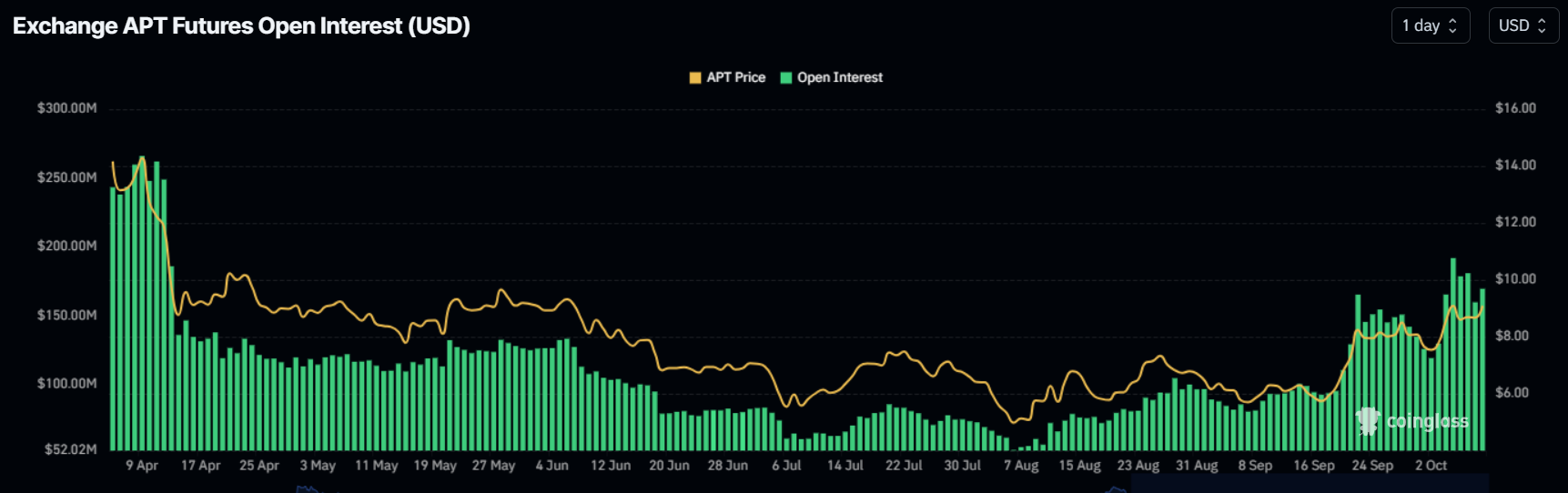 Dữ liệu on-chain của Aptos càng làm nổi bật thêm giả thuyết tăng giá. Theo số liệu từ Coinglass, lãi suất mở (OI) của hợp đồng tương lai ở Aptos tại các sàn giao dịch cũng đang có xu hướng gia tăng. OI phản ánh tổng số hợp đồng phái sinh chưa được thanh toán và cho biết liệu dòng tiền vào hợp đồng có đang tăng hay giảm.