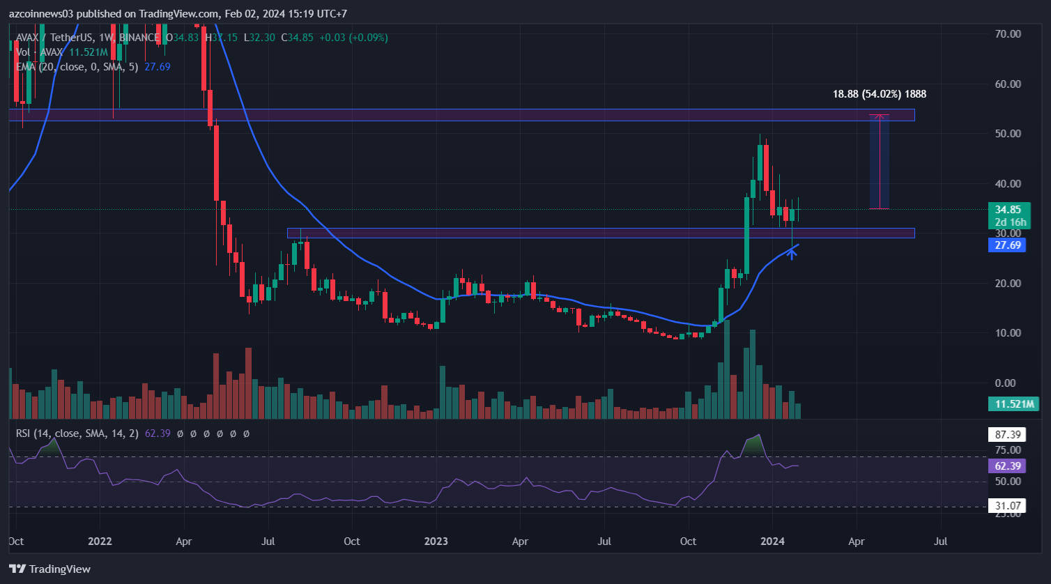 Tuy nhiên, nó hóa ra chỉ là một phá vỡ giả khi giá AVAX đã bật lên từ đường EMA 20 tuần (mũi tên màu xanh), giành lại vùng $30 và tạo ra một nến pin bar tăng giá.