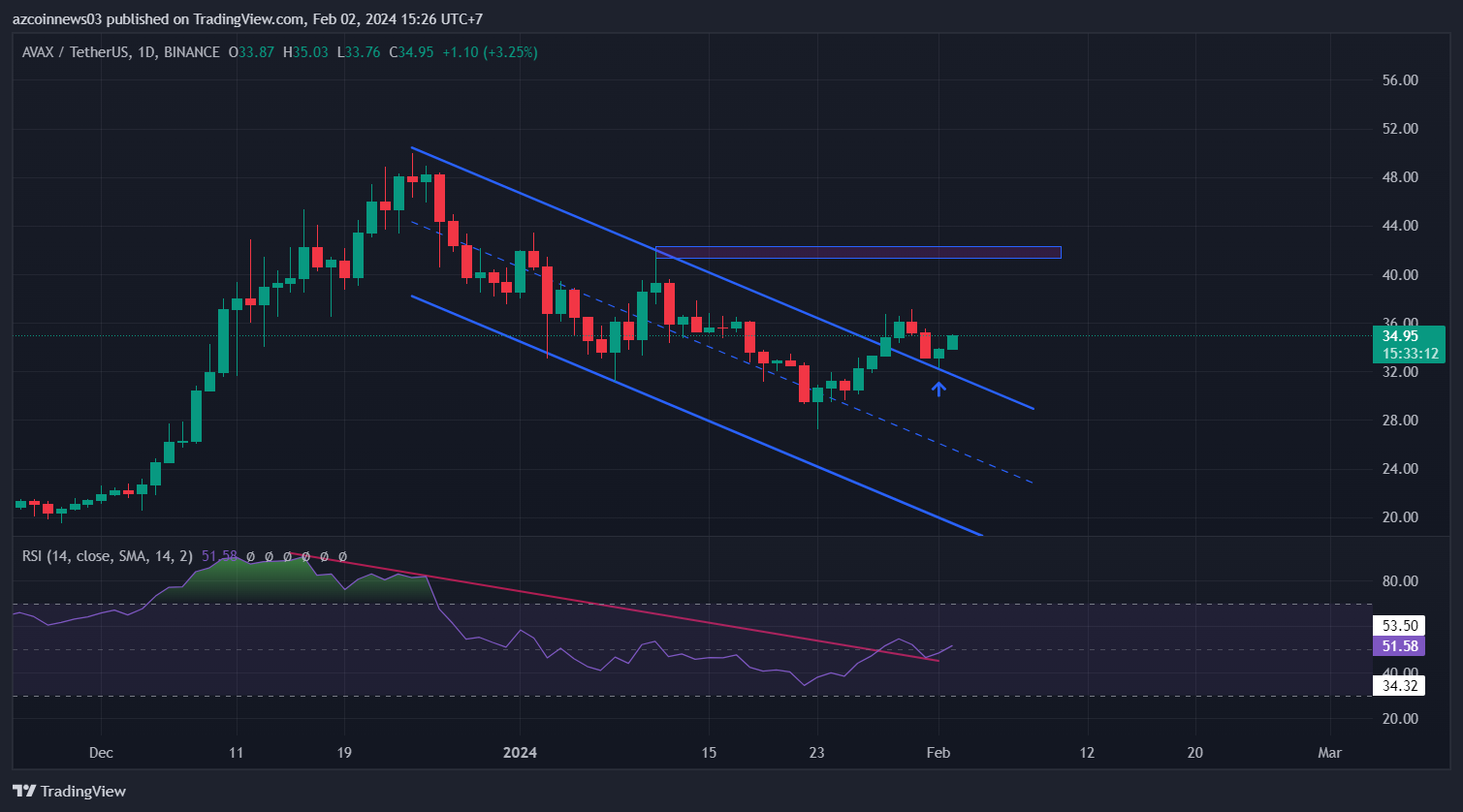 Biểu đồ hàng ngày cho thấy giá AVAX đã bứt phá lên trên một kênh song song giảm dần được hình thành kể từ mức cao hàng năm.