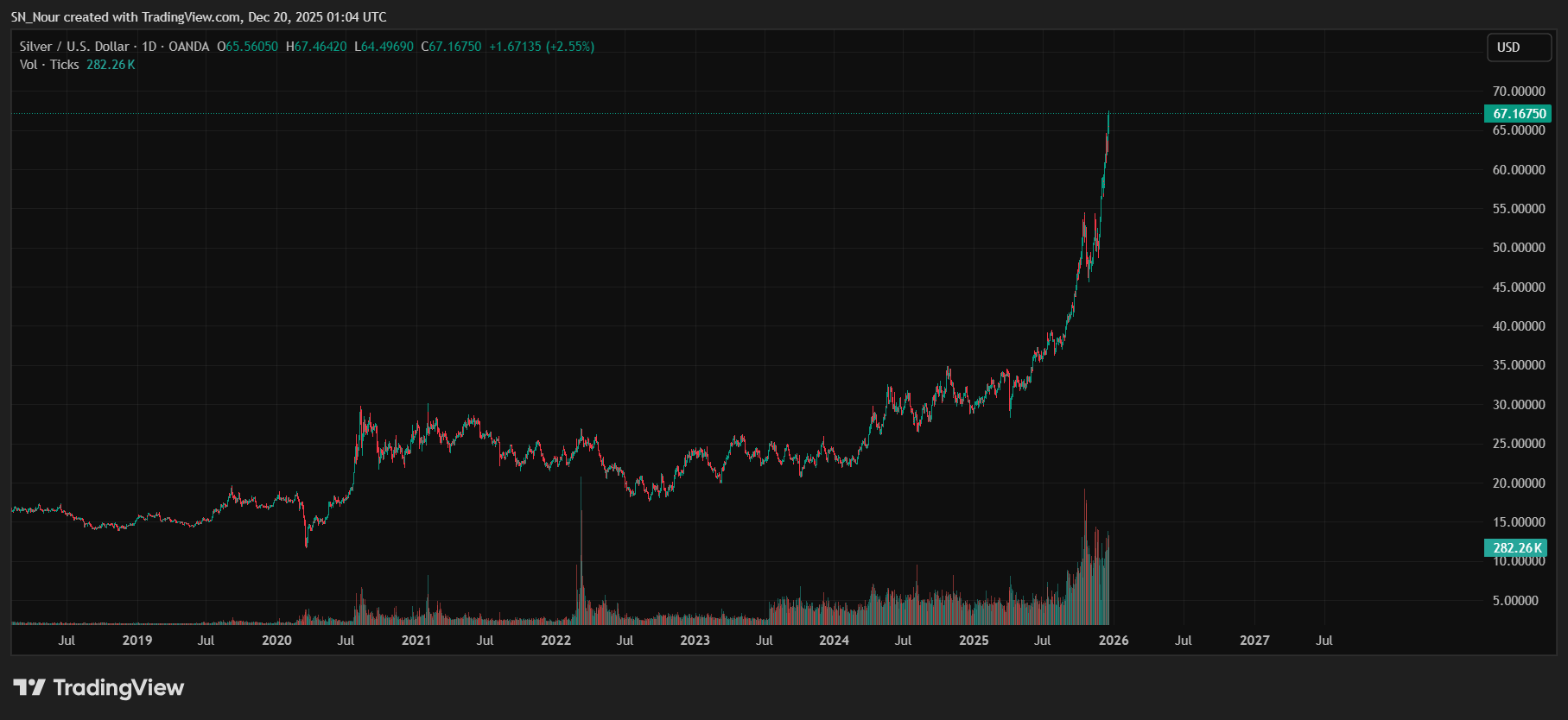 Giá bạc đạt mức cao kỷ lục mới trên 67 USD