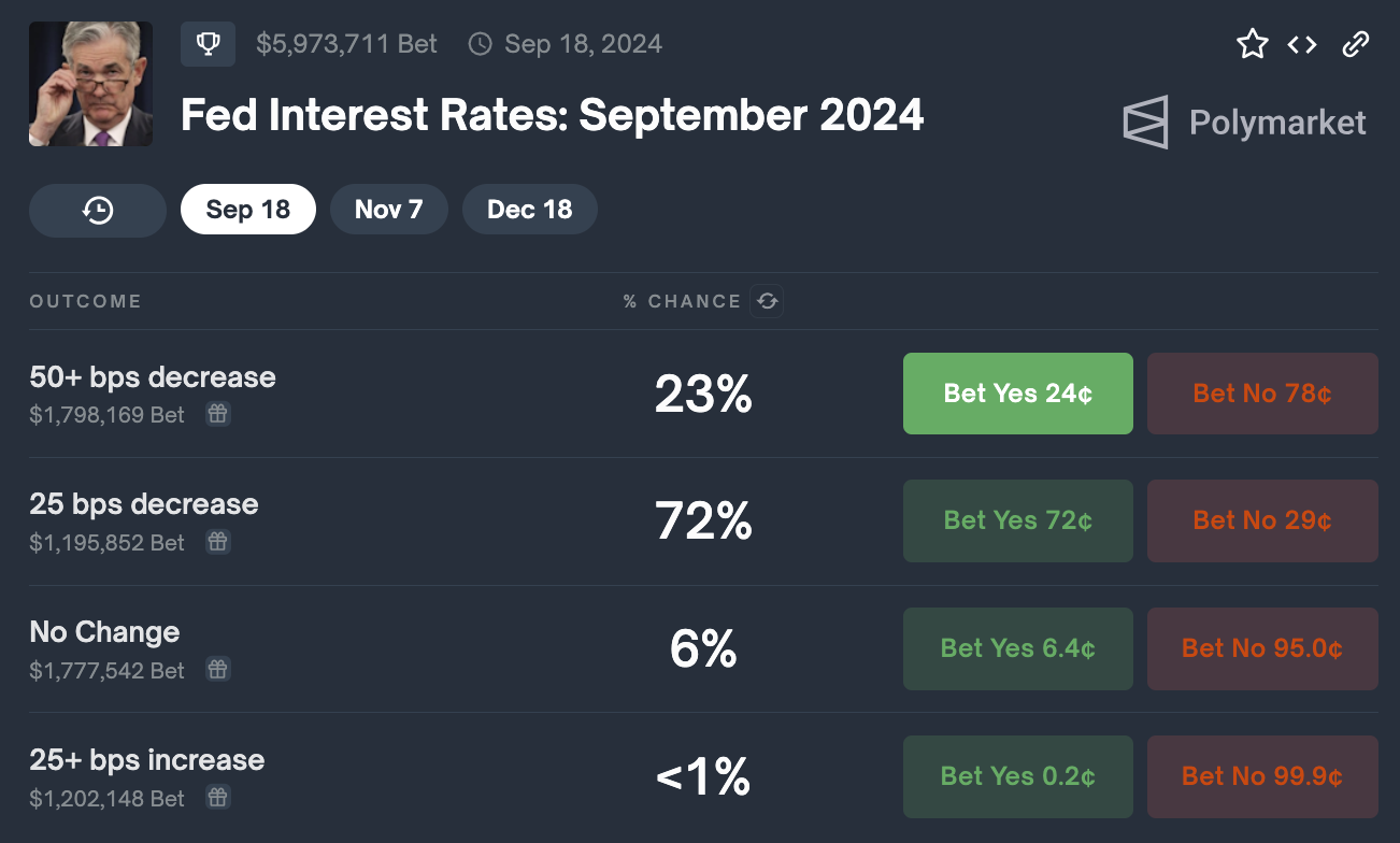 Điều thú vị là, tỷ lệ cắt giảm 25 điểm cơ bản đã giảm từ 77% xuống 72% trên Polymarket sau biên bản cuộc họp của Fed, trong khi tỷ lệ cắt giảm 50 điểm cơ bản trở lên tăng từ 18% lên 23%.