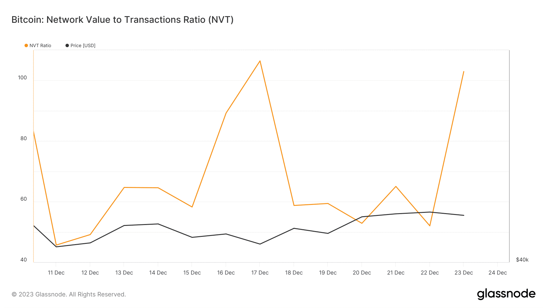 Phân tích cho thấy mặc dù giá BTC có phần đi ngang nhưng Tỷ lệ NVT lại tăng vọt đáng kể.