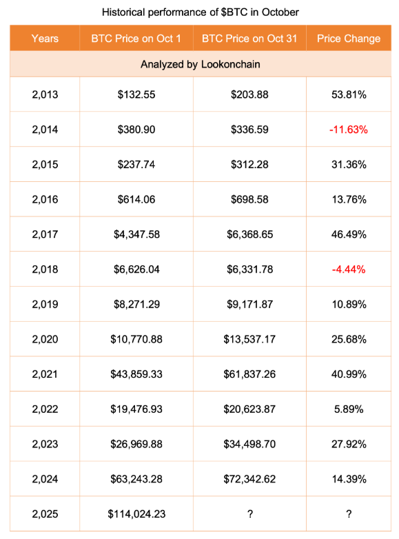Bitcoin (BTC) đã khép lại tháng 9 với mức tăng 5,35%, bất chấp cú điều chỉnh vào những ngày cuối tháng. Dữ liệu on-chain từ Lookonchain cho thấy, mỗi khi tháng 9 kết thúc trong sắc xanh, thị trường thường chứng kiến một “Pumptober” – giai đoạn bứt phá mạnh mẽ trong tháng 10.
