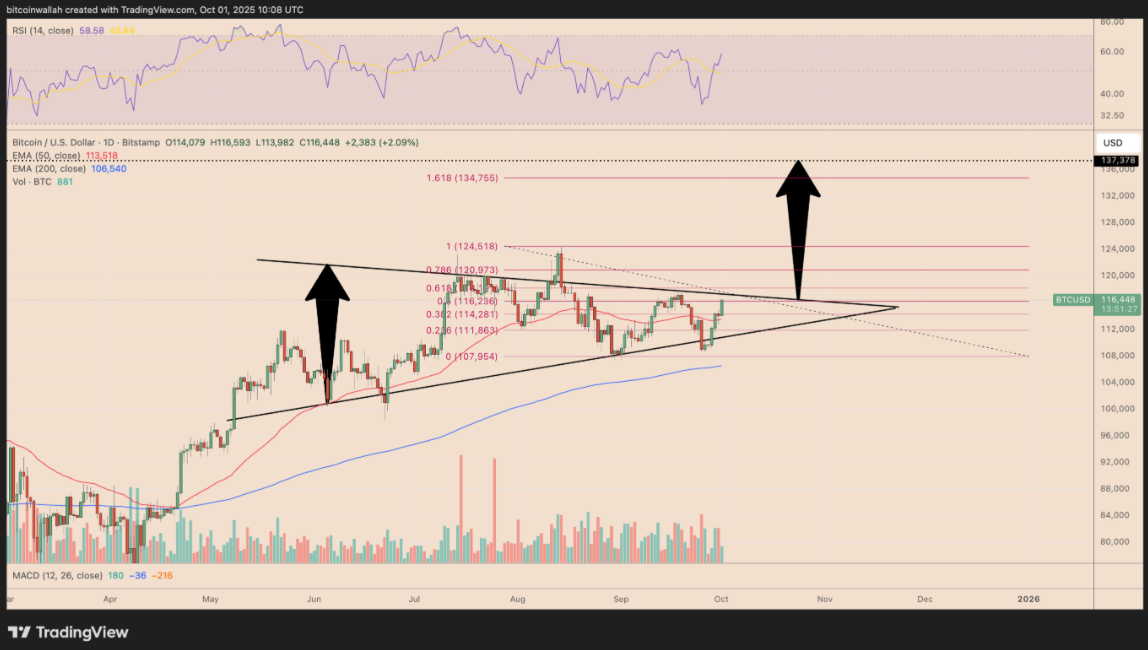 Dựa trên chiều cao của tam giác, mục tiêu tiềm năng được ước tính quanh vùng 137.000 USD, tương đương mức tăng hơn 18% so với giá hiện tại. Đáng chú ý, ngưỡng này gần như trùng khớp với mức Fibonacci mở rộng 1,618 tại vùng 134.700 USD, càng củng cố thêm độ tin cậy cho kịch bản tăng giá.