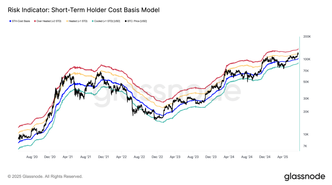 Từ đó, vùng rủi ro đầu tiên (heated zone) được xác định tại 122.000 USD, trong khi vùng quá nóng (overheated zone) ở mức 138.000 USD – ngưỡng thường gắn liền với các đỉnh chu kỳ trong quá khứ.