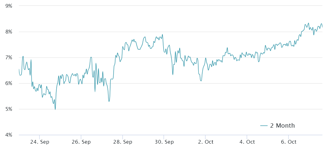 Lợi nhuận hàng năm hóa của hợp đồng tương lai BTC đã duy trì ở mức 8%, cho thấy nhu cầu về đòn bẩy tương đối cân bằng giữa những người lạc quan và bi quan. Một phần lý do thiếu sự tự tin của các nhà giao dịch xuất phát từ dòng chảy gần đây trong các quỹ ETF Bitcoin giao ngay, với 335 triệu USD dòng tiền ra ròng kể từ ngày 1 tháng 10, theo dữ liệu từ Farside Investors.