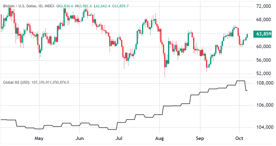 Trong thực tế, các sự kiện xã hội – chính trị dường như là yếu tố chính hạn chế đà tăng của Bitcoin. Từ tháng 6 đến tháng 10, cơ sở tiền tệ toàn cầu (M2) đã tăng từ 104 nghìn tỷ USD lên 108 nghìn tỷ USD, trong khi Bitcoin nhiều lần bị từ chối ở mức kháng cự 68.000 USD. Điều này gợi ý rằng đợt tăng lên 64.000 USD khó có thể bắt nguồn từ tình hình tài chính của Hoa Kỳ.
