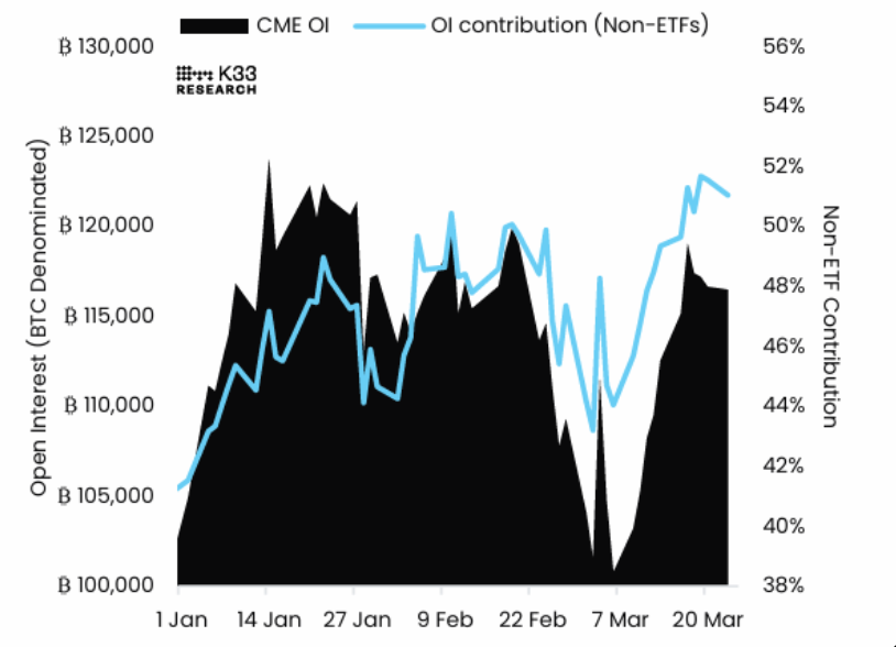 Báo cáo công bố hôm thứ Ba của K33 Research cho thấy hợp đồng mở (OI) của hợp đồng tương lai Bitcoin trên CME hầu như không biến động trong tuần qua. Diễn biến này phản ánh xu hướng đầu tư mang tính thụ động, ngay cả khi biến động nội tuần gia tăng và môi trường vĩ mô còn nhiều bất ổn, cho thấy các nhà đầu tư tổ chức vẫn né tránh rủi ro định hướng, cả ở phía mua lẫn bán.