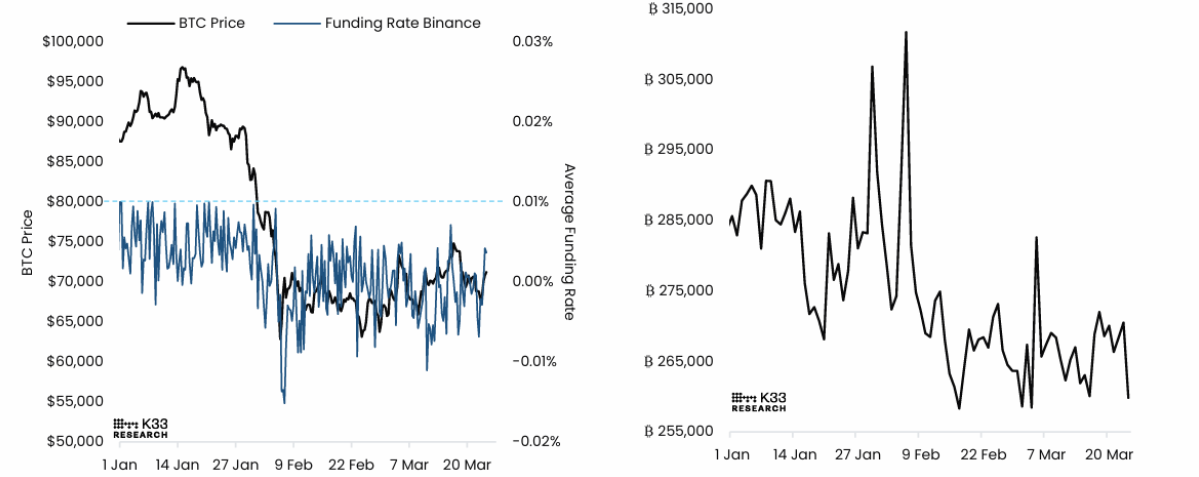 Ở thị trường hợp đồng vĩnh cửu, bức tranh cũng không có nhiều thay đổi so với tuần trước. OI đã giảm về gần mức thấp nhất trong năm, hiện dưới 260.000 BTC, cho thấy các trader vẫn dè dặt trong việc gia tăng vị thế.