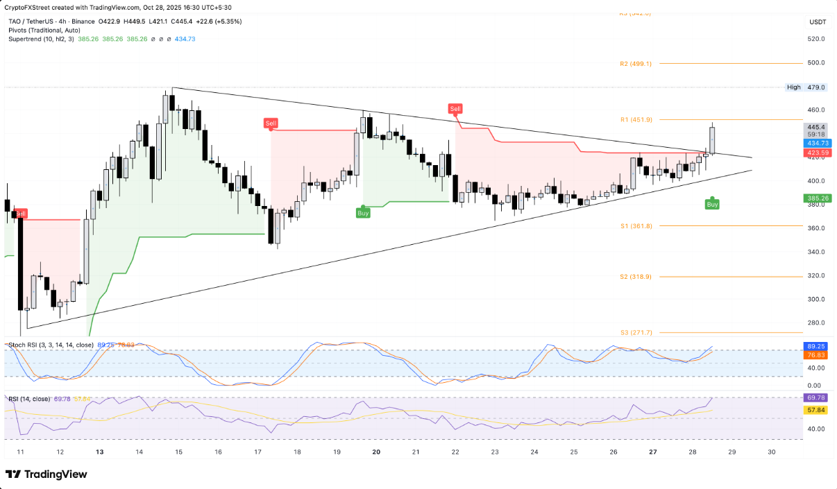 Trên phương diện kỹ thuật, TAO đã phá vỡ mô hình tam giác cân trên khung 4 giờ, cho tín hiệu rằng đà tăng hiện tại vẫn còn nhiều dư địa để mở rộng, đặc biệt khi dòng tiền đang tiếp tục đổ vào các tài sản liên quan đến AI.
