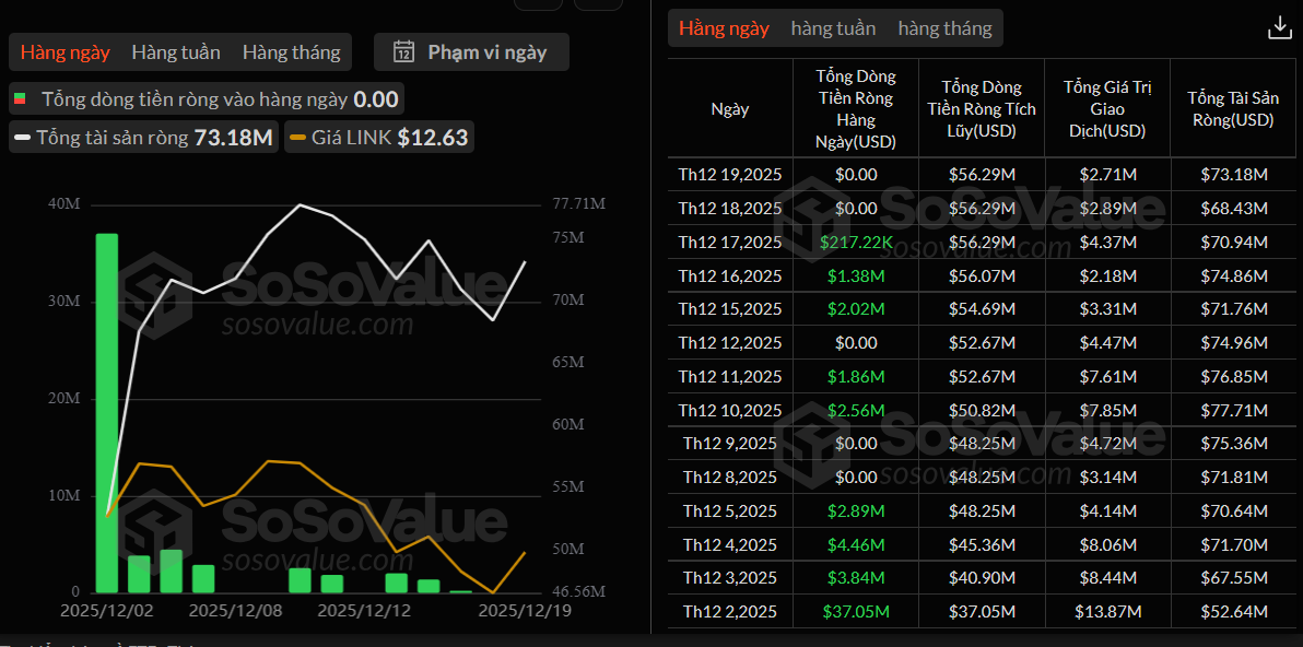Ở chiều ngược lại, thị trường ETF giao ngay của Chainlink tiếp tục ghi nhận trạng thái trầm lắng. Trong hai ngày thứ Năm và thứ Sáu, không có dòng vốn vào hay ra các quỹ ETF liên quan. Trước đó, dữ liệu từ SoSoValue cho thấy dòng tiền vào đạt khoảng 217.000 USD vào thứ Tư và 1,38 triệu USD vào thứ Ba.