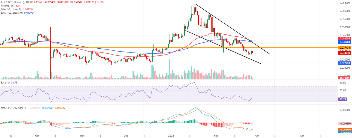 Tại thời điểm viết bài vào thứ Năm, giá Chiliz đang giao dịch trong sắc đỏ quanh mốc 0,034 USD. Bức tranh ngắn hạn vẫn nghiêng nhẹ về xu hướng giảm khi giá tiếp tục bị kìm hãm bên dưới đường xu hướng giảm kéo dài từ đỉnh 0,064 USD, đồng thời nằm dưới cả hai đường trung bình động hàm mũ (EMA) 50 ngày và EMA 100 ngày. Cụm EMA này hiện hội tụ và tạo vùng kháng cự đáng chú ý quanh 0,040–0,041 USD.