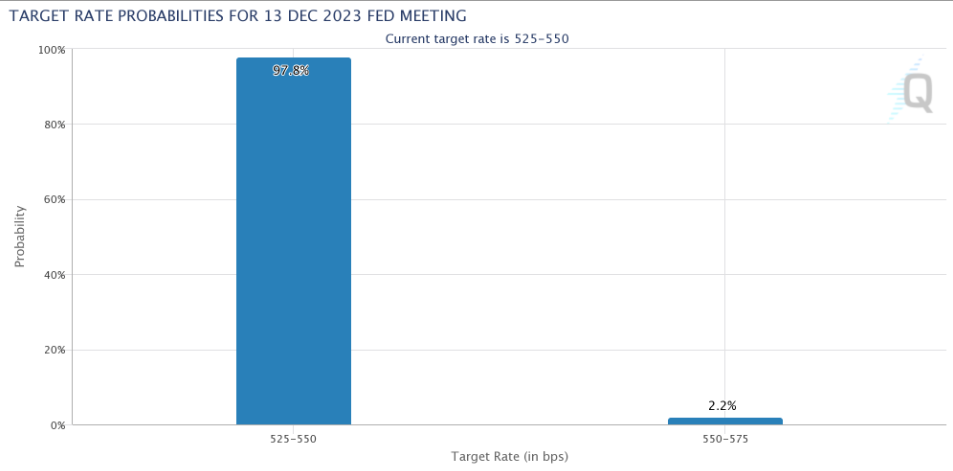 Cuộc họp tiếp theo của Ủy ban Thị trường mở Liên bang (FOMC), sẽ diễn ra vào giữa tháng 12, khi đó mọi thay đổi về lãi suất sẽ được công bố. Theo dữ liệu từ FedWatch Tool của CME Group, kể từ ngày 1/12, có đến 97,8% các nhà phân tích tham gia khảo sát ủng hộ việc tạm dừng tăng lãi suất.
