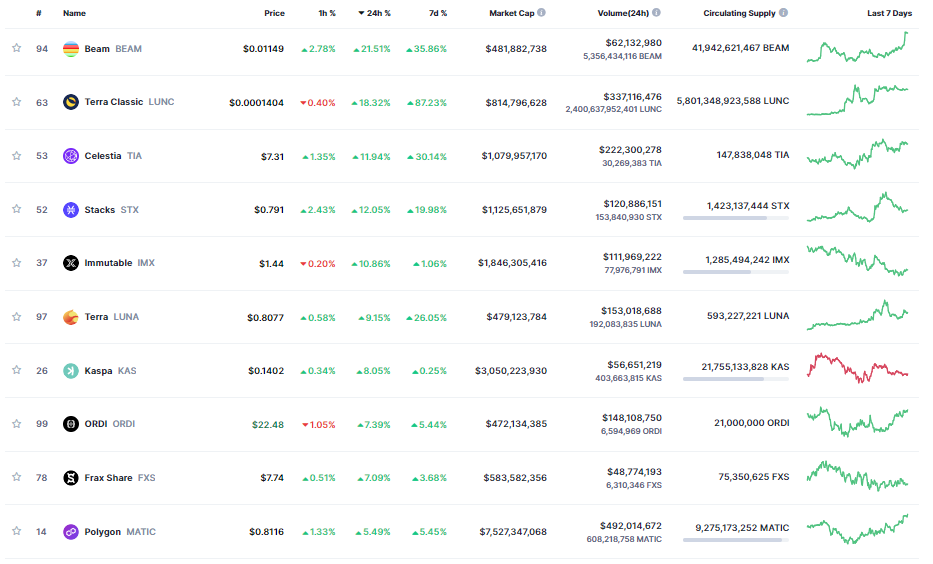 Theo sau là Terra Classic (LUNC), Stacks (STX), Immutable (IMX), Celestia (TIA) cùng mức tăng trưởng hơn 10% trong ngày.