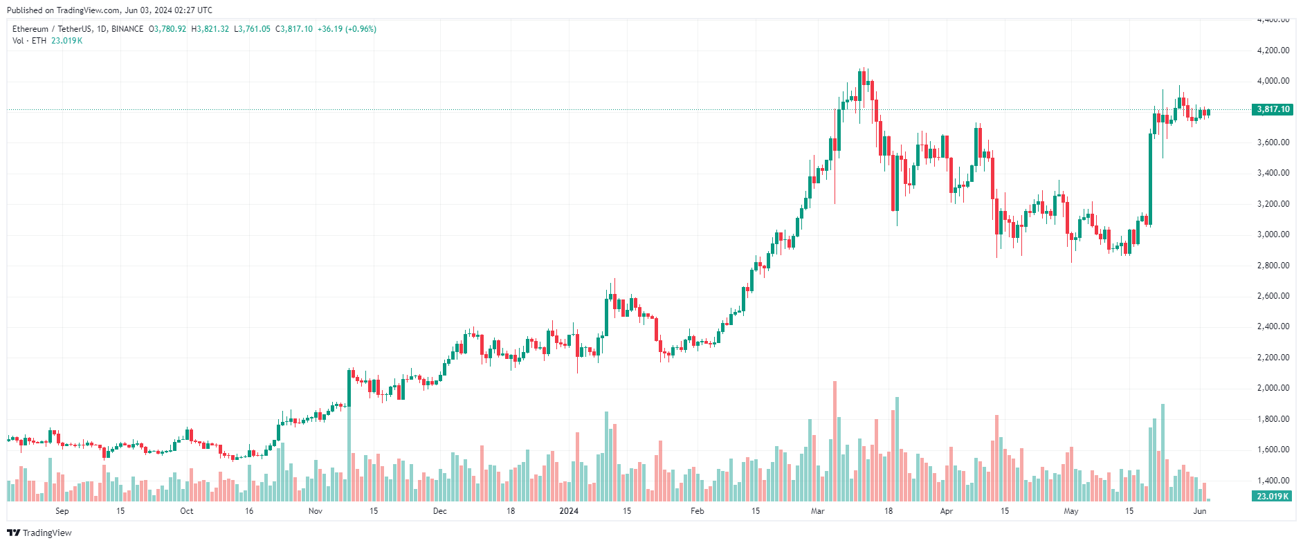 Ethereum (ETH) khép lại tuần qua trong sắc đỏ khi giảm nhẹ hơn 1%. Đà tăng trưởng trong tuần trước, vốn được thúc đẩy bởi sự cường điệu về Ether ETF giao ngay, đã chững lại sau khi chạm mốc $ 3.977 vào ngày 27/05.