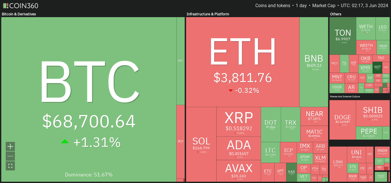Về phía Altcoin, thị trường diễn biến trái chiều khi Bitcoin vẫn tiếp tục tích luỹ bên dưới khu vực $ 70.000 trong suốt những ngày qua.