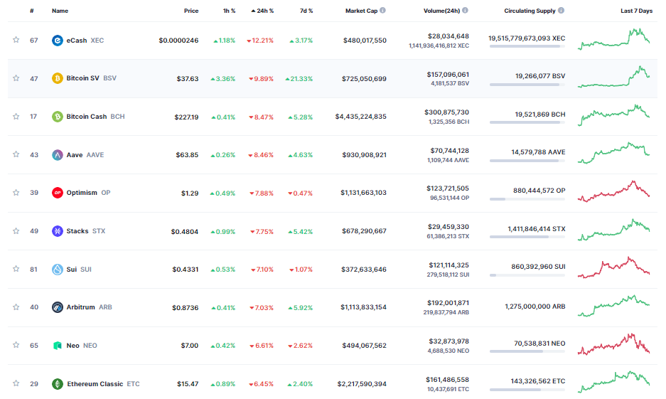 Bitcoin SV (BSV), Bitcoin Cash (BCH), Aave (AAVE), Optimism (OP), Stacks (STX), Sui (SUI), Arbitrum (ARB), Neo (NEO), Ethereum Classic (ETC), ApeCoin (APE), Decentraland (MANA), Terra Classic (LUNC), Mina (MINA), Pepe (PEPE), Arweave (AR), dYdX (DYDX), Flow (FLOW), Maker (MKR), Compound (COMP), Aptos (APT), Hedera (HBAR)… đồng loạt quay đầu giảm từ 5-9%.
