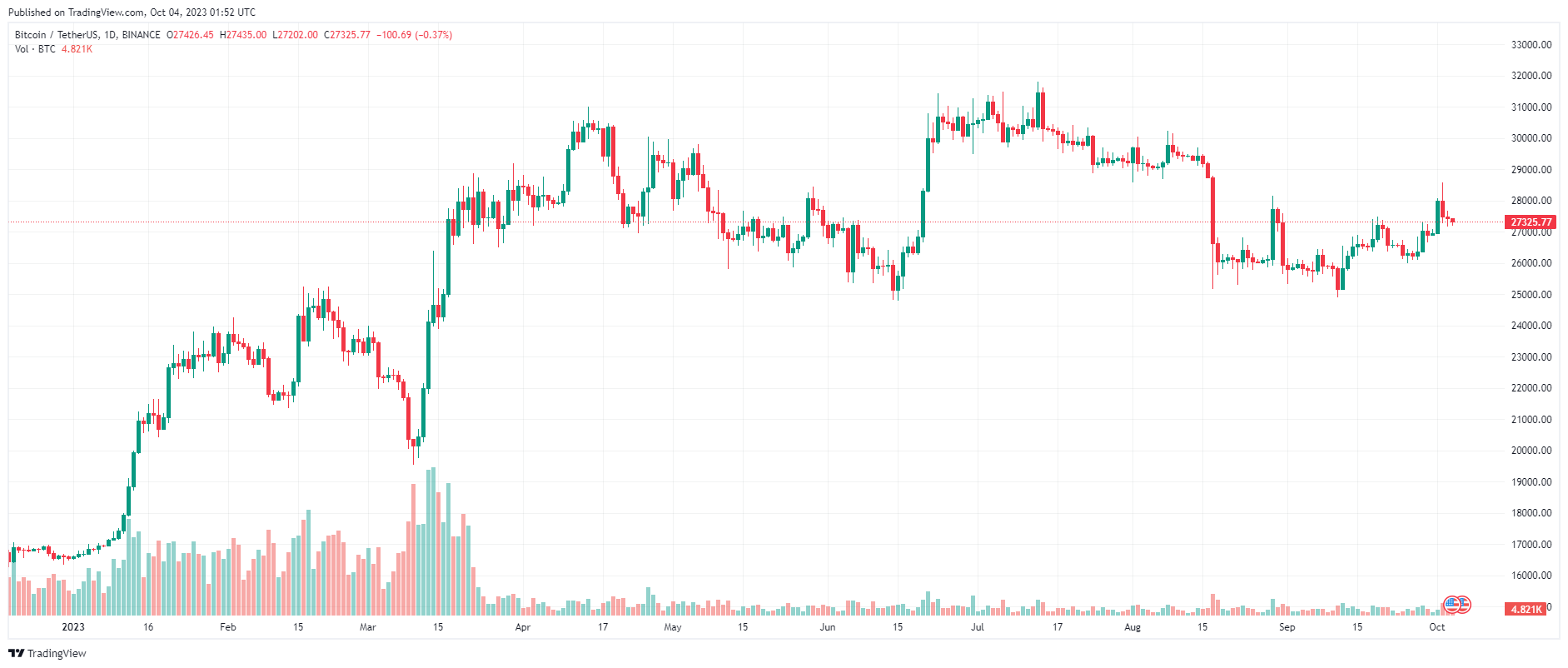 Tuy nhiên, Bitcoin đã không thể duy trì mức tăng đột biến, giảm mạnh trong ngày hôm qua do hoạt động chốt lời. Tài sản hàng đầu tiếp tục mất thêm gần 1% trong 24 giờ qua xuống quanh $ 27.300 vào thời điểm hiện tại.