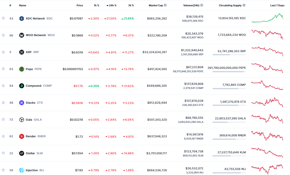 Các altcoin khác như WOO Network (WOO), XRP (XRP), Pepe (PEPE), Compound (COMP), Stacks (STX), Gala (GALA), Render (RNDR), Stellar (XLM), Injective(INJ)… đồng loạt giảm nhẹ từ 2-5%.