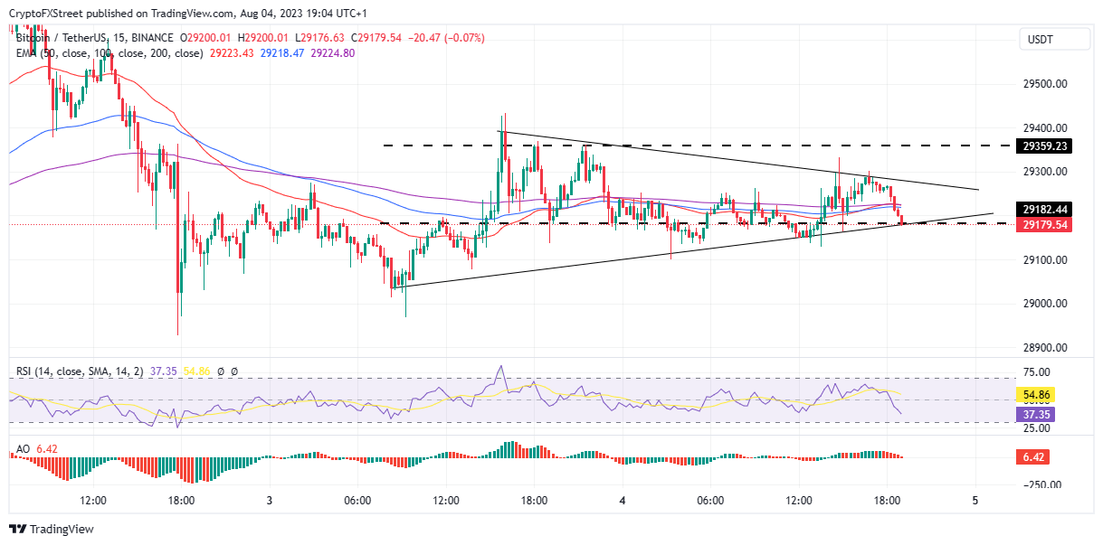Giá Bitcoin (BTC) kiểm tra ranh giới dưới của mô hình tam giác hình thành trên biểu đồ 15 phút, với triển vọng giảm giá tổng thể sau khi lật các Đường EMA 200, 100 và 50 ngày ở mức $ 29.224, $ 29.218, và $ 29.223 tương ứng thành mức kháng cự.