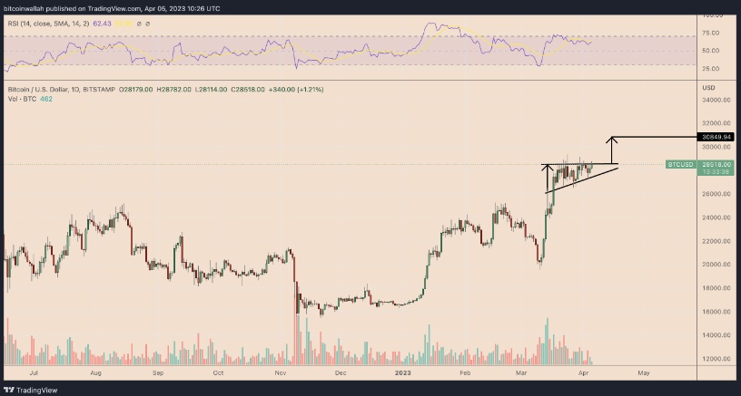 Từ góc độ kỹ thuật, giá Bitcoin hướng tới một đợt tăng giá kéo dài vào tháng 4 khi nó hình thành mô hình tam giác tăng dần.