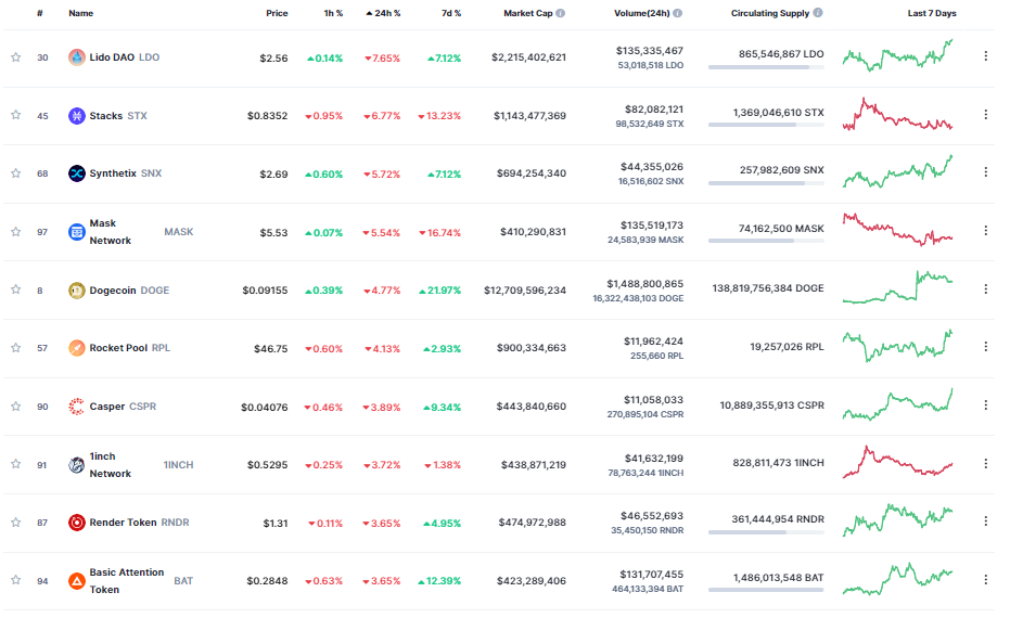 Đa phần các altcoin trong top 100 đều đang ghi nhận sắc đỏ với các dự án như Lido DAO (LDO), Stacks (STX), Synthetix (SNX), Mask Network (MASK), Dogecoin (DOGE), Rocket Pool (RPL), Casper (CSPR), 1inch Network (1INCH), Render Token (RNDR), Basic Attention Token (BAT)… mất từ 3-7% giá trị.