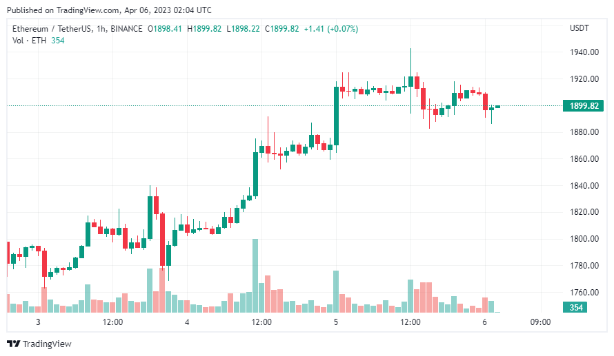 Sau khi vượt $ 1.900 trong ngày hôm qua, Ethereum (ETH) tiếp tục đi ngang quanh khu vực này và hiện đang được giao dịch tại $ 1.898, giảm hơn 0,5% trong ngày.