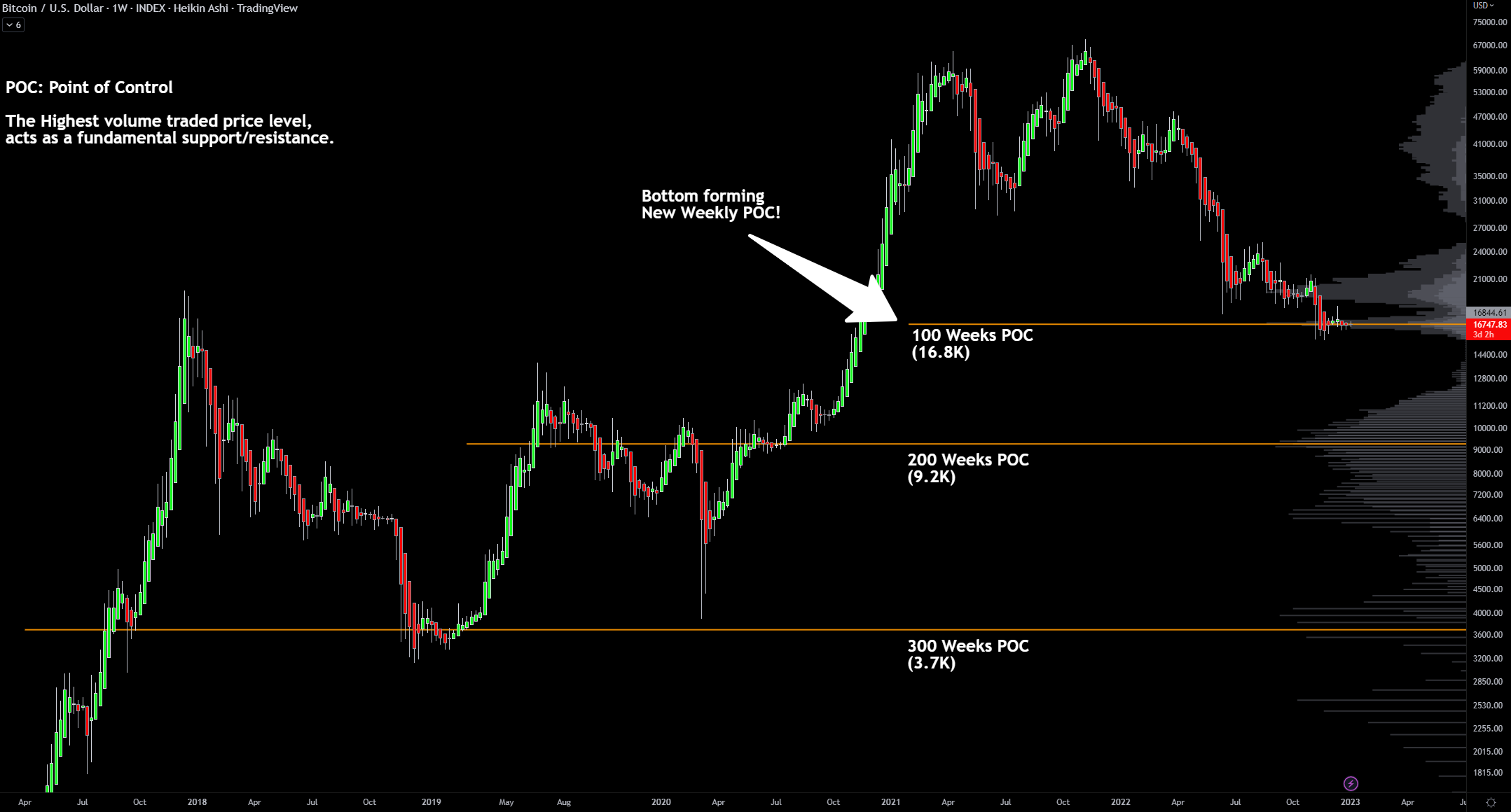 “16.800 là 100 POC hàng tuần mới cho Bitcoin. Nói một cách đơn giản, trong 100 tuần qua, đây là mức mà hầu hết khối lượng đã được giao dịch, tạo ra khả năng hình thành đáy”.