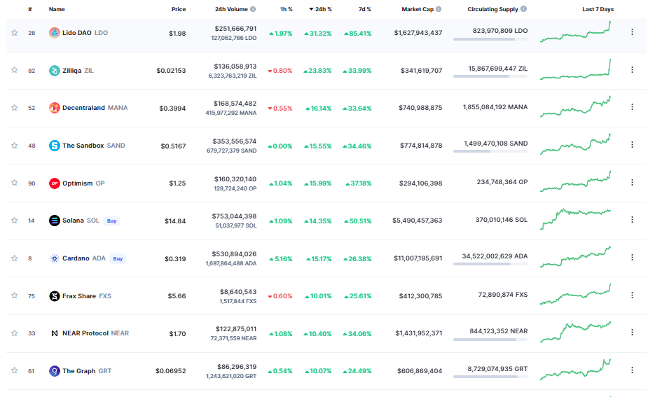 Các altcoin khác như Decentraland (MANA), The Sandbox (SAND), Optimism (OP), Solana (SOL), Cardano (ADA), Frax Share (FXS), NEAR Protocol (NEAR), The Graph (GRT)… cũng bật tăng từ 10-16% trong ngày.