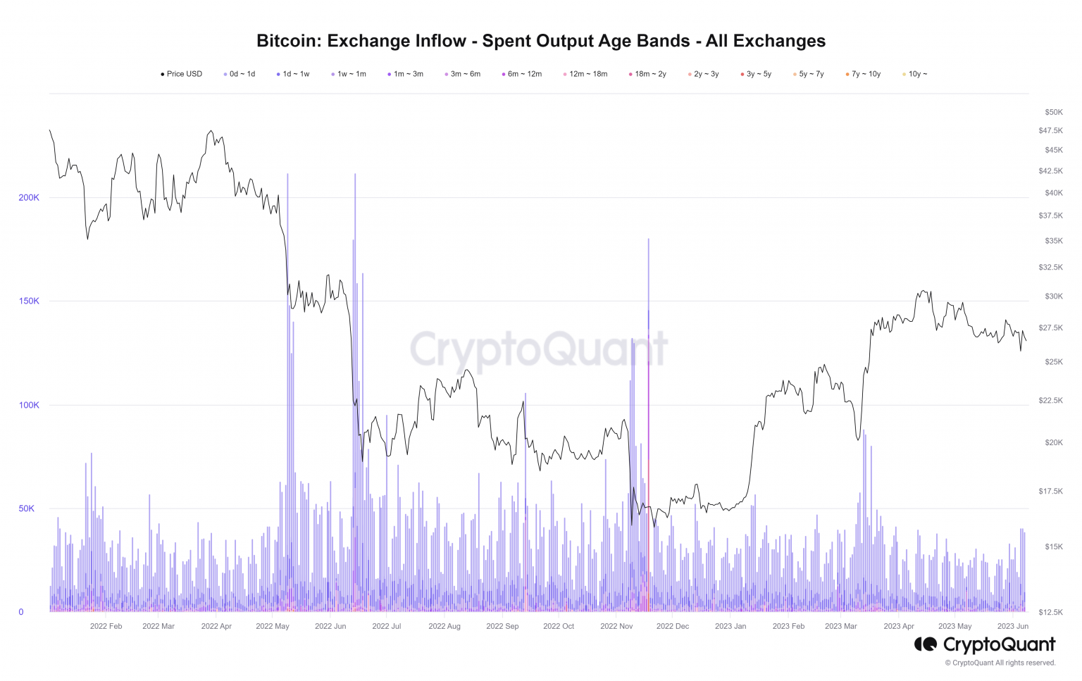 Hơn nữa, Chỉ báo Exchange Inflow – Spent Output Value Bands cho thấy khối lượng Bitcoin chủ yếu được bán ra bởi trader nắm giữ từ 1 đến 10.000 BTC trong 13 tháng qua.