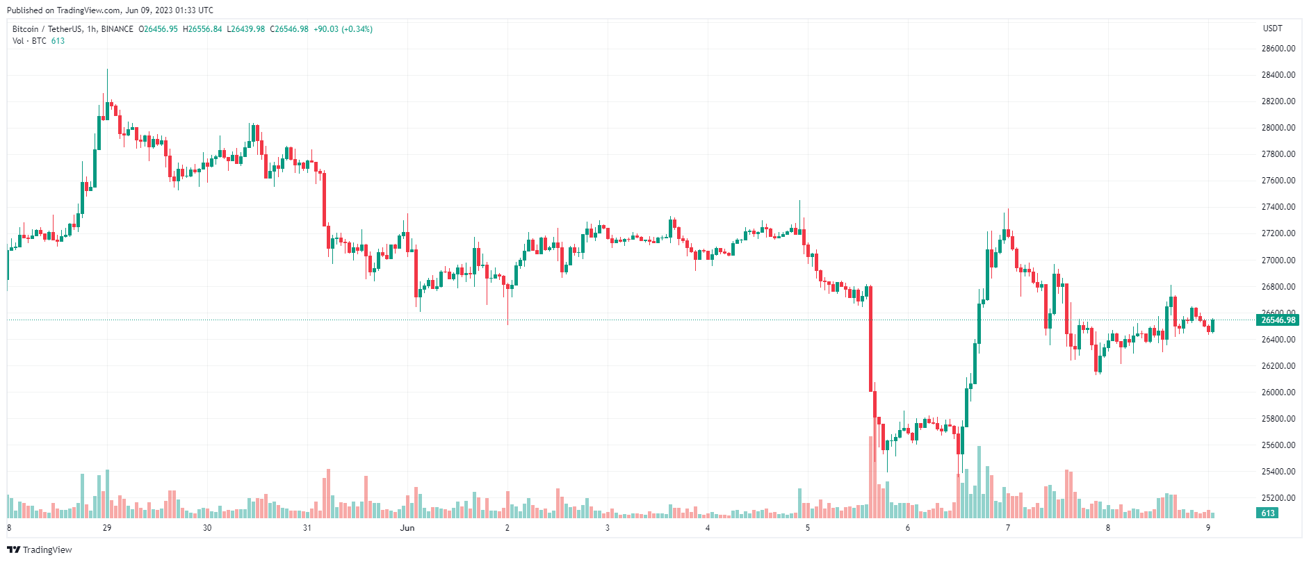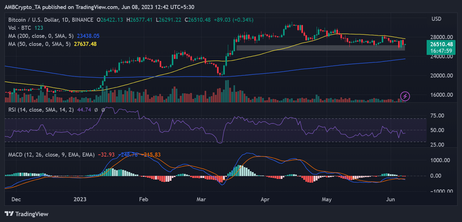 Trên biểu đồ khung thời gian hàng ngày, chuyển động giá của Bitcoin cho thấy xu hướng đáng chú ý bắt đầu vào ngày 4 tháng 6. Trong khoảng thời gian này, Bitcoin đã trải qua những biến động mạnh. Tuy nhiên, nó đã cố gắng duy trì phạm vi hỗ trợ của mình, dao động quanh $ 25.000 đến $ 26.000.
