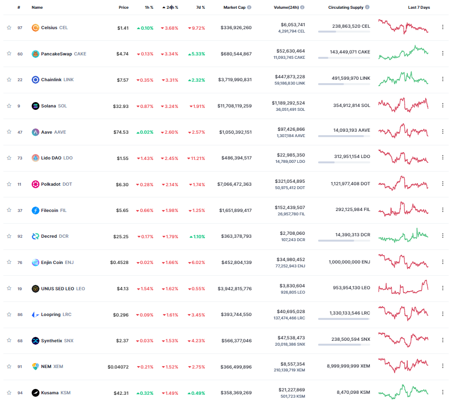 Khi Bitcoin đóng cửa hàng tháng ảm đạm, các altcoin cũng không mấy khởi sắc. Phần lớn trong top 100 đang trong sắc đỏ, dẫn đầu là CEL, CAKE, LINK, SOL đều đang giảm hơn 3% trong ngày. Các coin giảm giá còn lại đang chứng kiến mức lỗ dao động trong khoảng 0,1-2,6%.