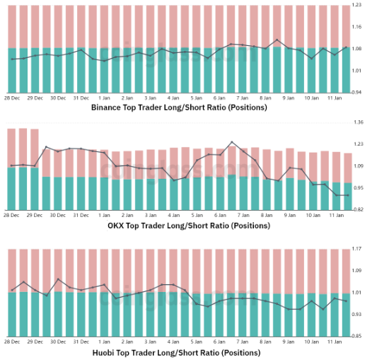 Chẳng hạn, tỷ lệ đối với các nhà giao dịch trên Binance đứng vững ở mức 1,08 từ ngày 9/1 đến ngày 12/1. Trong khi đó, các trader hàng đầu tại Huobi đã giảm đòn bẩy long khi chỉ báo chuyển từ 1,09 xuống 0,91. Cuối cùng, tại sàn giao dịch OKX, tỷ lệ long-to-short tăng nhẹ, chuyển từ 0,95 vào ngày 9/1 sang 0,97.