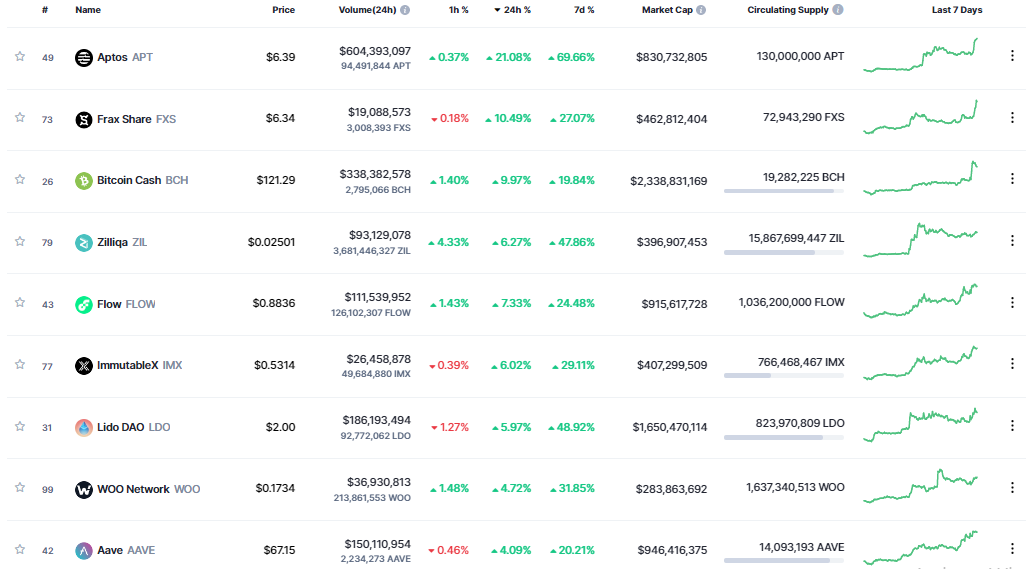 Các dự án khác như Frax Share (FXS), Bitcoin Cash (BCH), Zilliqa (ZIL), Flow (FLOW), ImmutableX (IMX), Lido DAO (LDO), WOO Network (WOO), Aave (AAVE)… cũng ghi nhận đà tăng từ 4-10%.