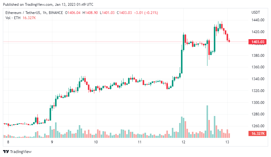 Cùng với đà tăng của Bitcoin, Ethereum (ETH) đã bật tăng vượt $ 1.400, thiết lập đỉnh cục bộ tại $ 1.438 trước khi điều chỉnh nhẹ về $ 1.403 vào thời điểm hiện tại.